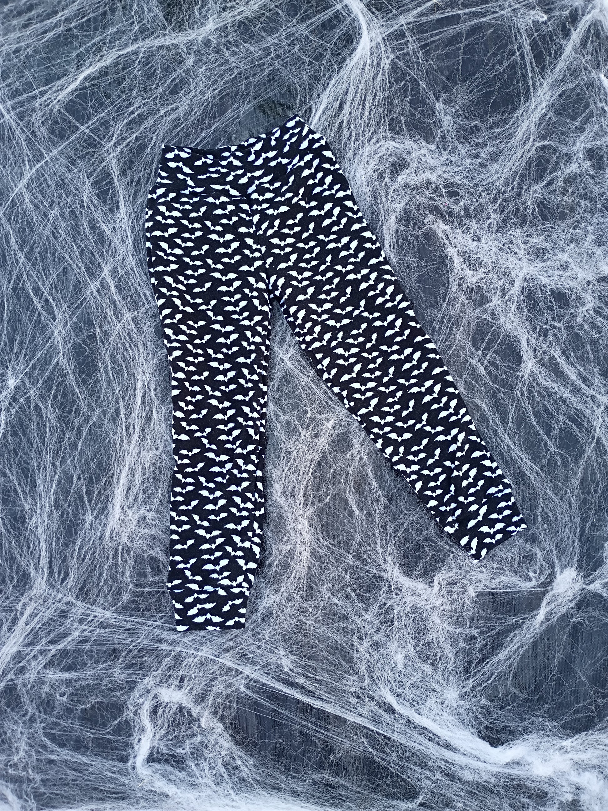Cuffed pants with a wide waist band. Glow in the dark bats complete this look.